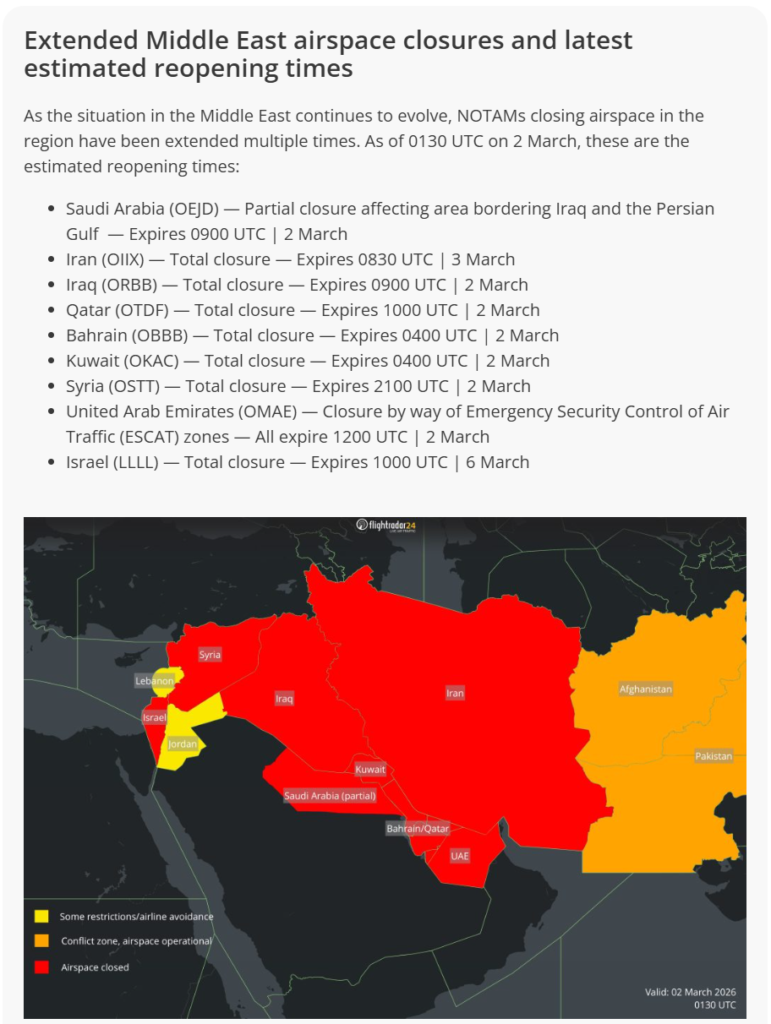 In conflictsituaties worden NOTAMs vaak voor korte tijdspannes uitgegeven en nadien verlengd. Dat verklaart waarom luchtruimen soms tijdelijk heropenend lijken om vervolgens opnieuw te sluiten. Dat is geen besluiteloosheid, maar een manier om de situatie voortdurend opnieuw te beoordelen zonder vooraf langdurige sluitingen vast te leggen.