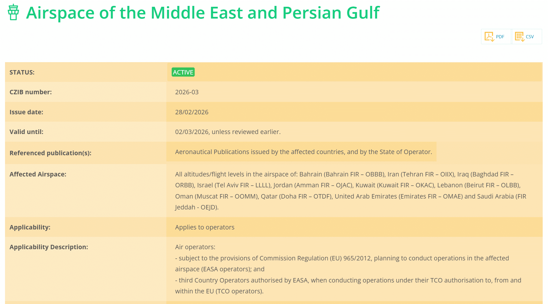 Sinds 28 februari 2026 is CZIB 2026‑03 van kracht, uitgegeven na Amerikaanse en Israëlische militaire aanvallen op doelen in Iran en aangekondigde Iraanse vergeldingsacties. In dat bulletin beschouwt EASA het volledige luchtruim – op alle hoogtes – boven onder meer Iran, Israël, Irak, Jordanië, Libanon, de Golfstaten en Saudi‑Arabië als hoog risico.